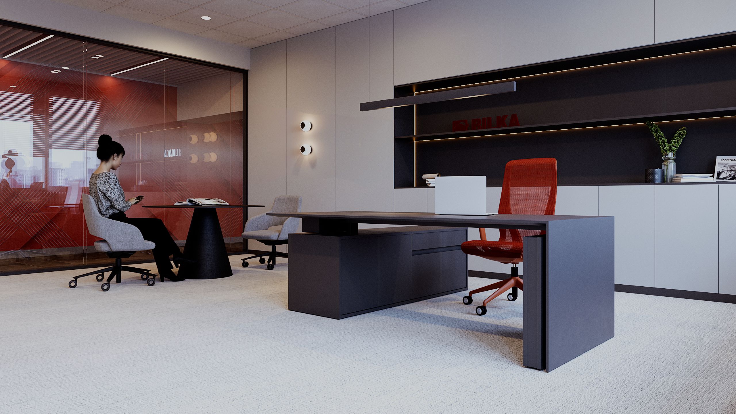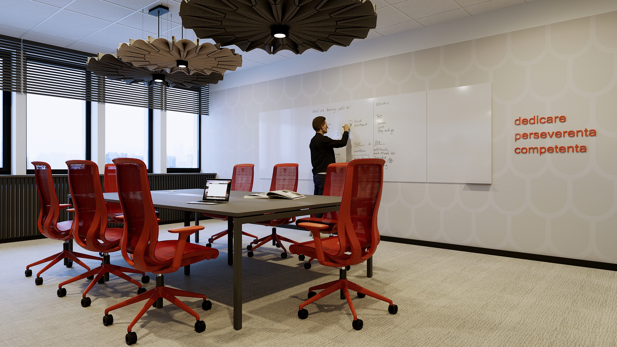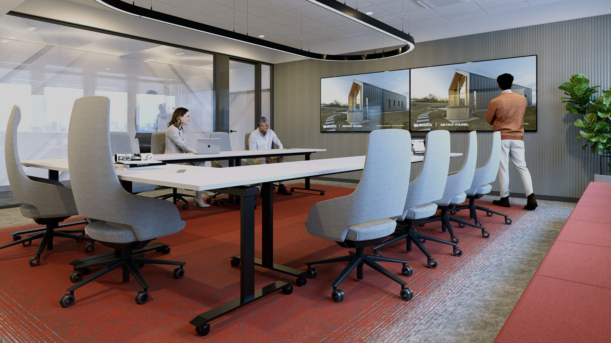 Sala de meeting continuă limbajul vizual al proiectului, prin utilizarea accentelor cromatice puternice și a liniilor curate. Scaunele ergonomice roșii devin elemente definitorii, oferind atât confort, cât și coerență estetică. Spațiul este gândit pentru colaborare eficientă, fiind dotat cu echipamente moderne și iluminat adecvat, care susține productivitatea și comunicarea.
