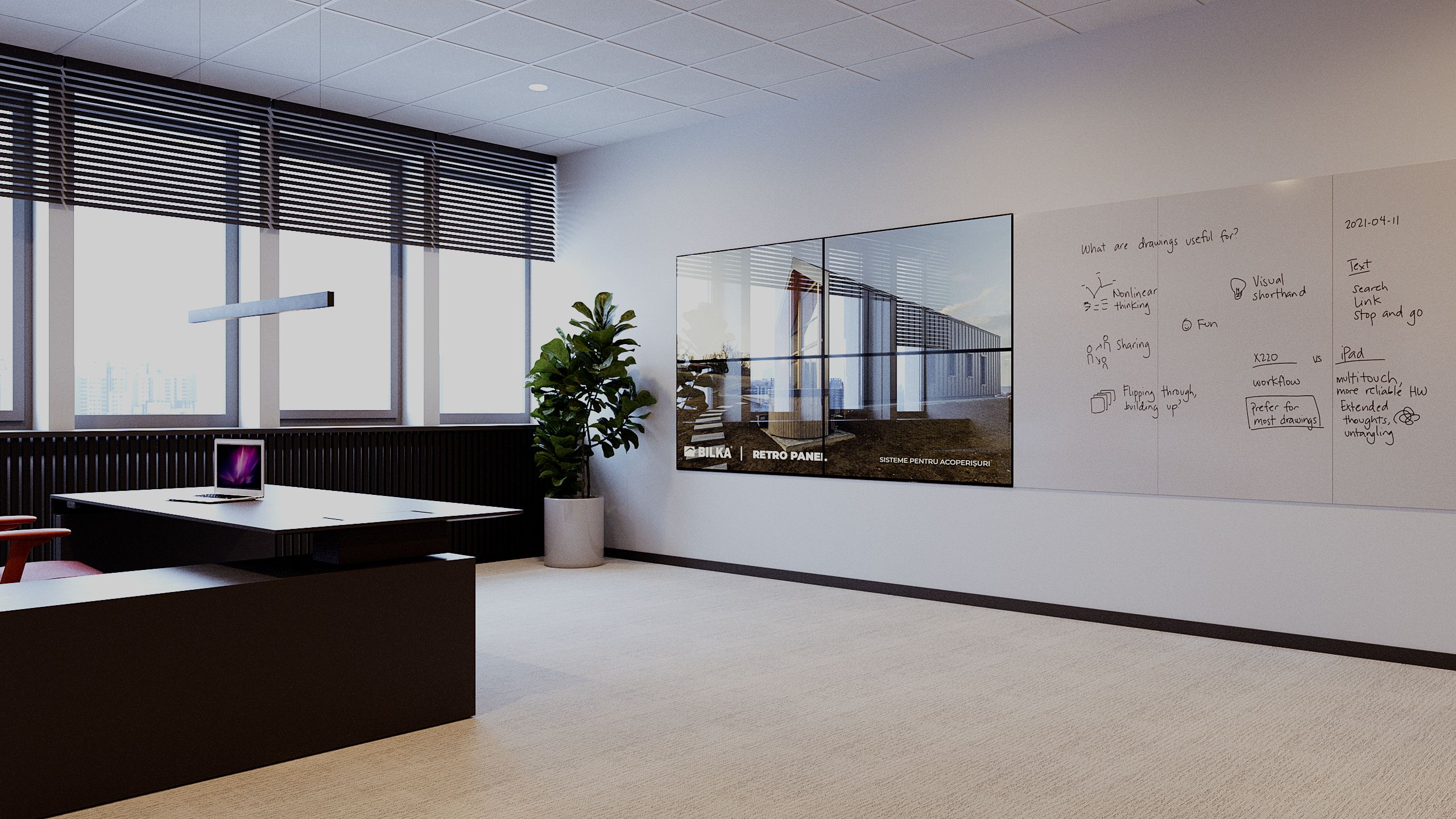 Prin acest concept de design interior pentru birouri, proiectul demonstrează cum estetica poate susține funcționalitatea într-un mod echilibrat. Integrarea elementelor naturale, a tehnologiei și a identității vizuale creează un mediu de lucru modern, adaptat nevoilor actuale. Rezultatul este un spațiu profesionist, flexibil și reprezentativ, care reflectă valorile companiei și contribuie la o experiență de lucru de calitate.