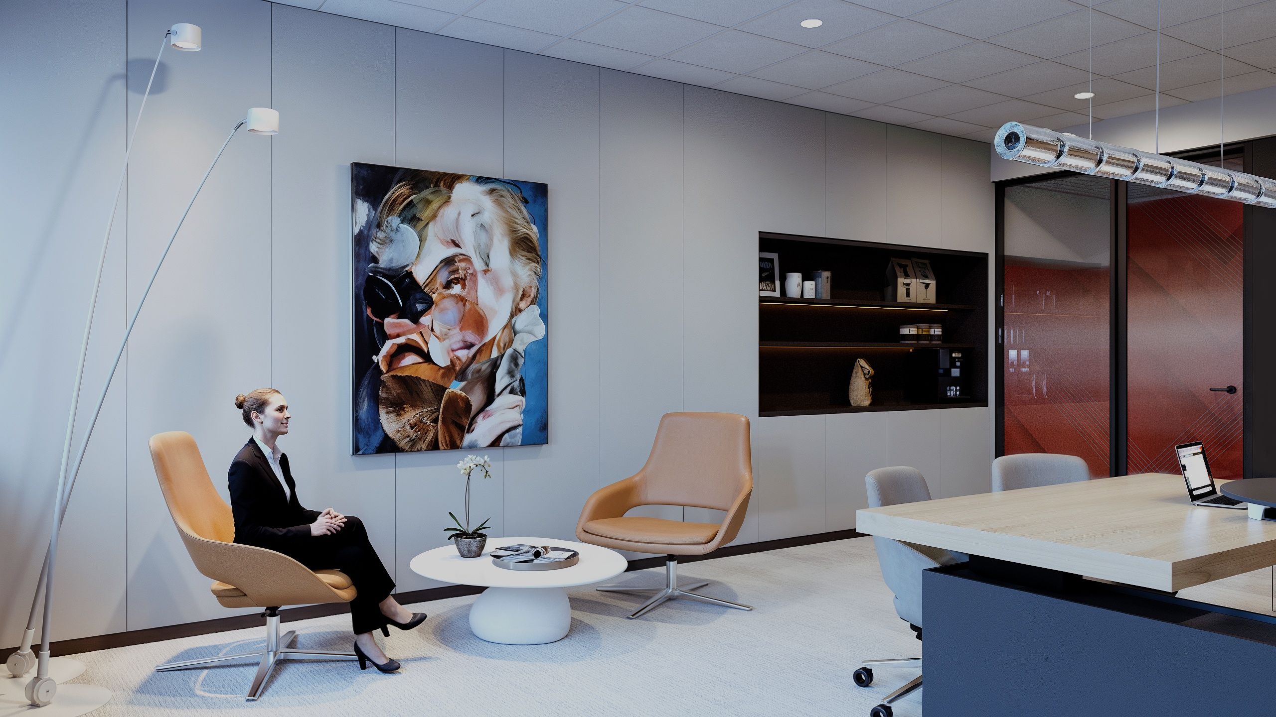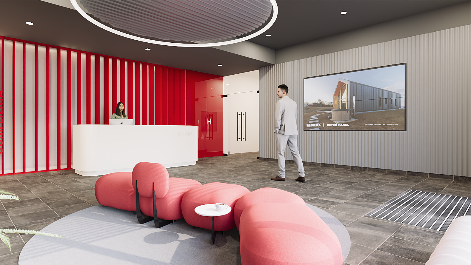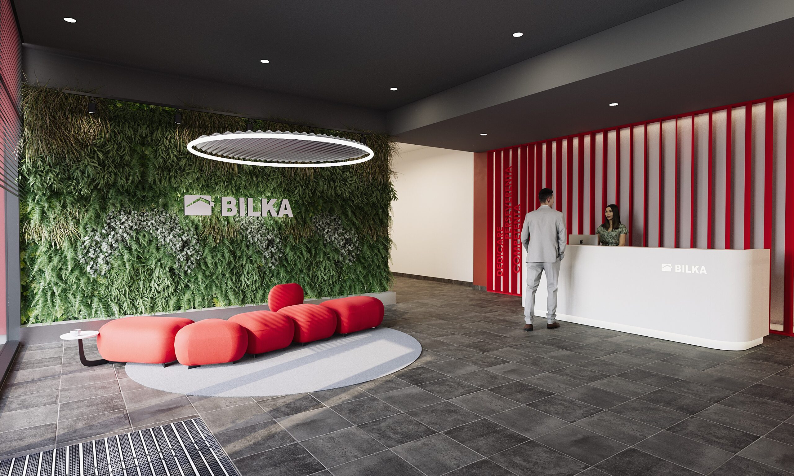 Acest proiect de amenajare interioară pentru birouri evidențiază o abordare contemporană, în care identitatea vizuală a brandului este integrată coerent în arhitectura spațiului. Zona de recepție impresionează prin contrastul dintre peretele vegetal natural și accentele puternice de roșu, creând un echilibru între dinamism și confort. Elementele de branding sunt atent poziționate, iar mobilierul cu forme fluide contribuie la o primă impresie profesională și memorabilă.