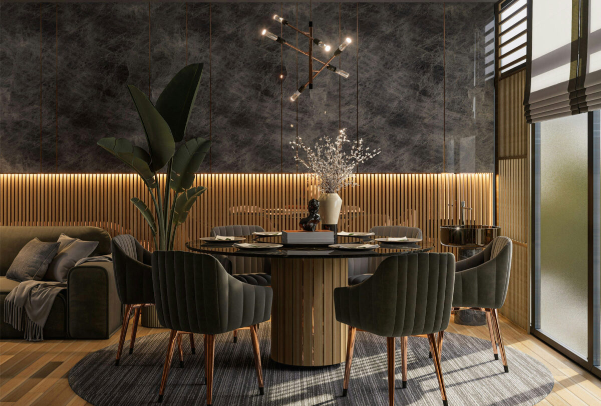 Natural textures, such as wood, stone, and woven materials, combined with rich, deep blue tones, create a harmonious flow that seamlessly connects the various spaces throughout the home. This thoughtful combination not only enhances visual continuity but also evokes a sense of calm and cohesion, making each room feel like an intentional extension of the next.